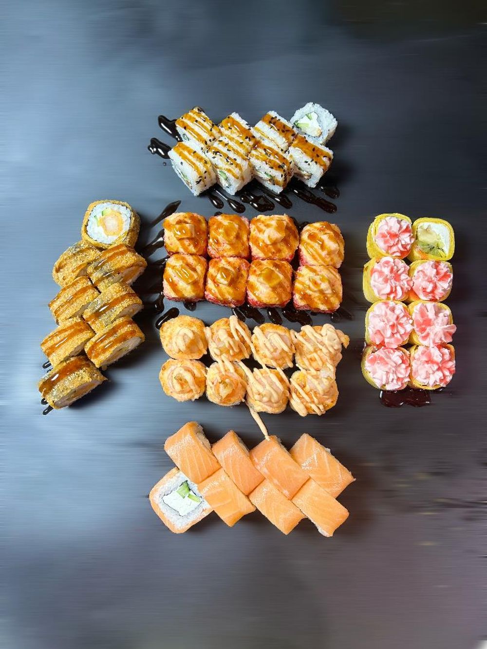 ролл десертный, ролл запеченный с лососем, темпура креветка, филадельфия, запеченный с креветкой, ролл эльза