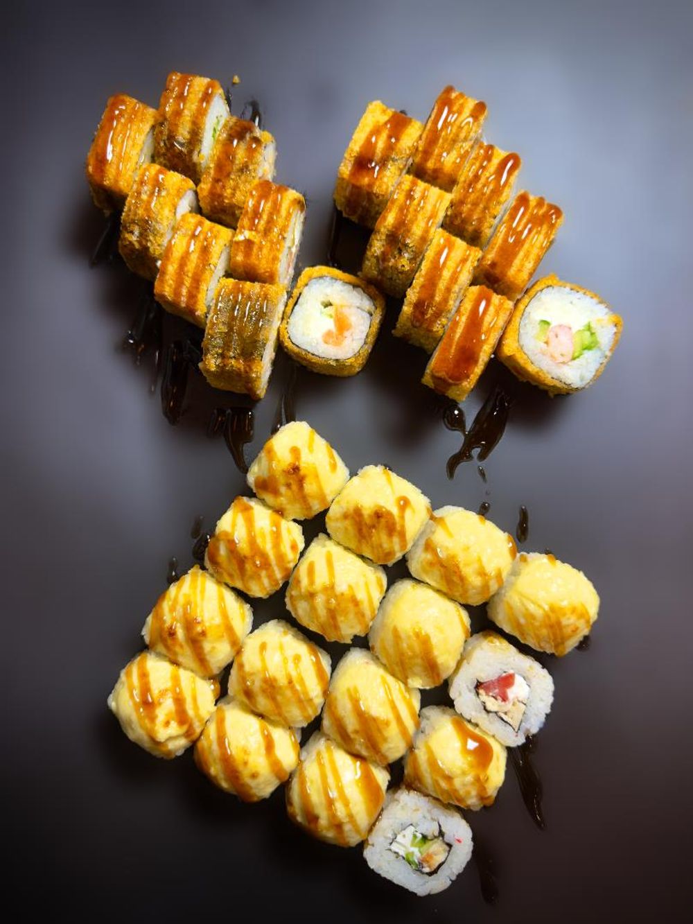 темпура с креветкой, темпура с лососем, запеченный с угрем, запеченный с курицей