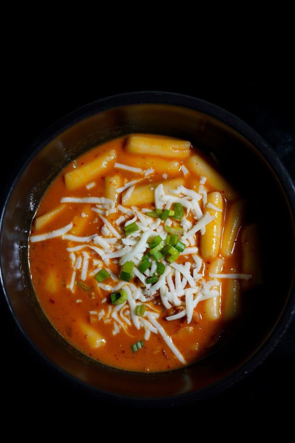 рисовые палочки, бекон, соус кимчи, лук зеленый, чеснок, сыр моцарелла, паста качудян, бульон рыбный жидкий