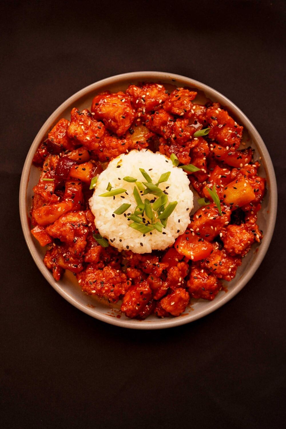 грудка куриная, ананасы, рис, перец, лук, соус кисло-сладкий, кунжут