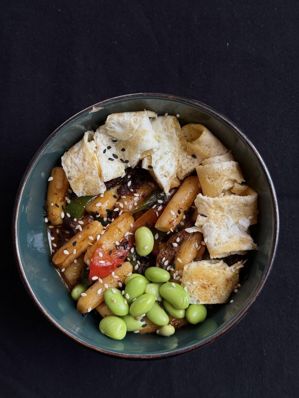 рисовые палочки, бобы соевые, говядина филе, перец св, грибы шампиньоны, паста качудян, лук зеленый, масло кунж, жид.курин.бульон