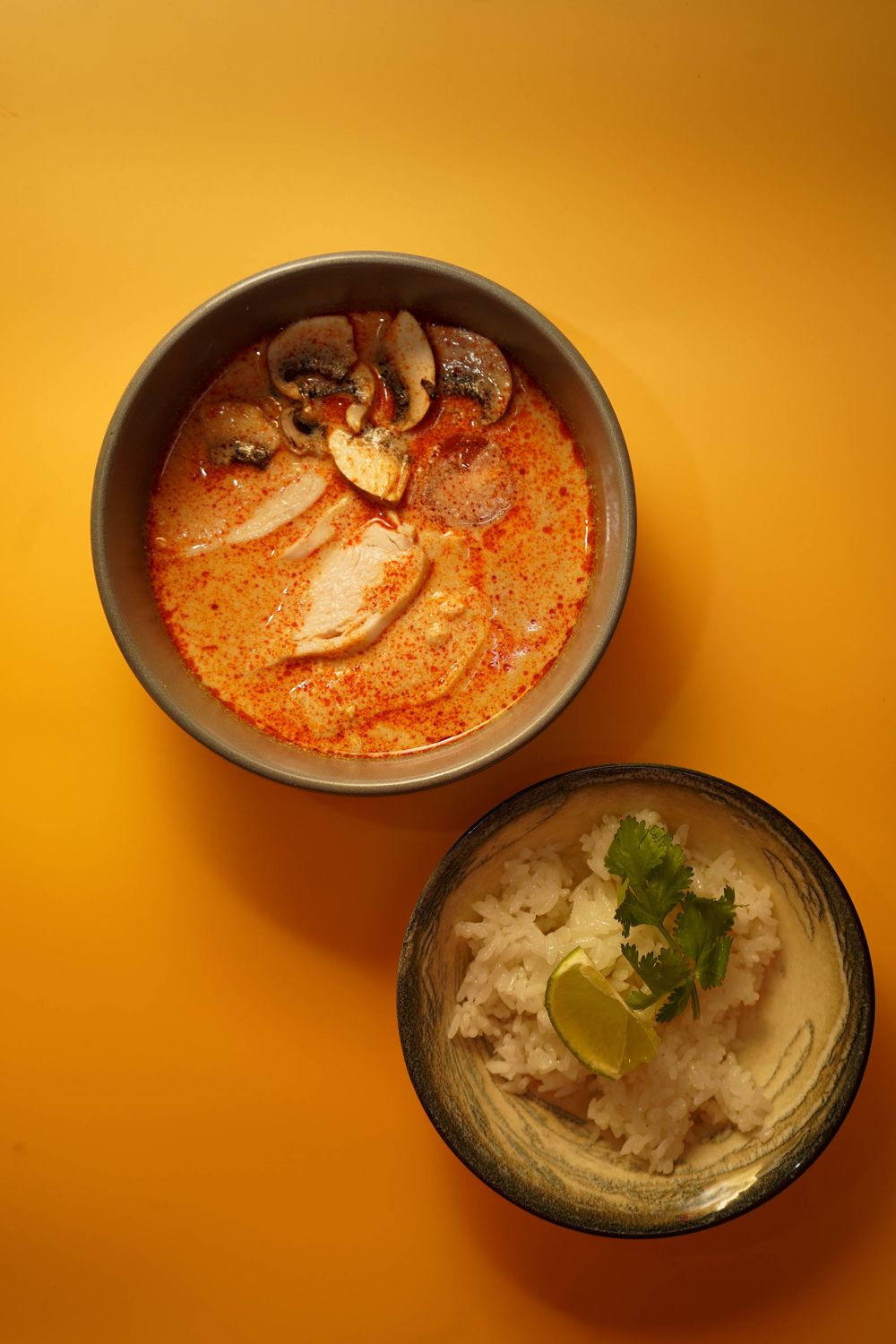 креветки, шампиньоны, черри, молоко кокосовое, сливки, специи, лайм, кинза, рис отварной