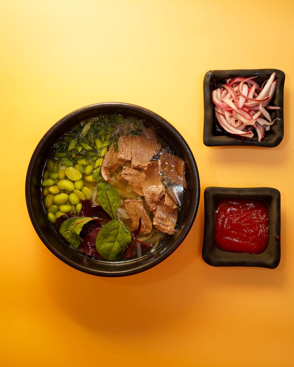говядина, лапша рисовая, бобы соевые, лук зеленый, специи, лук маринованный, соус шрирача, микс зелени